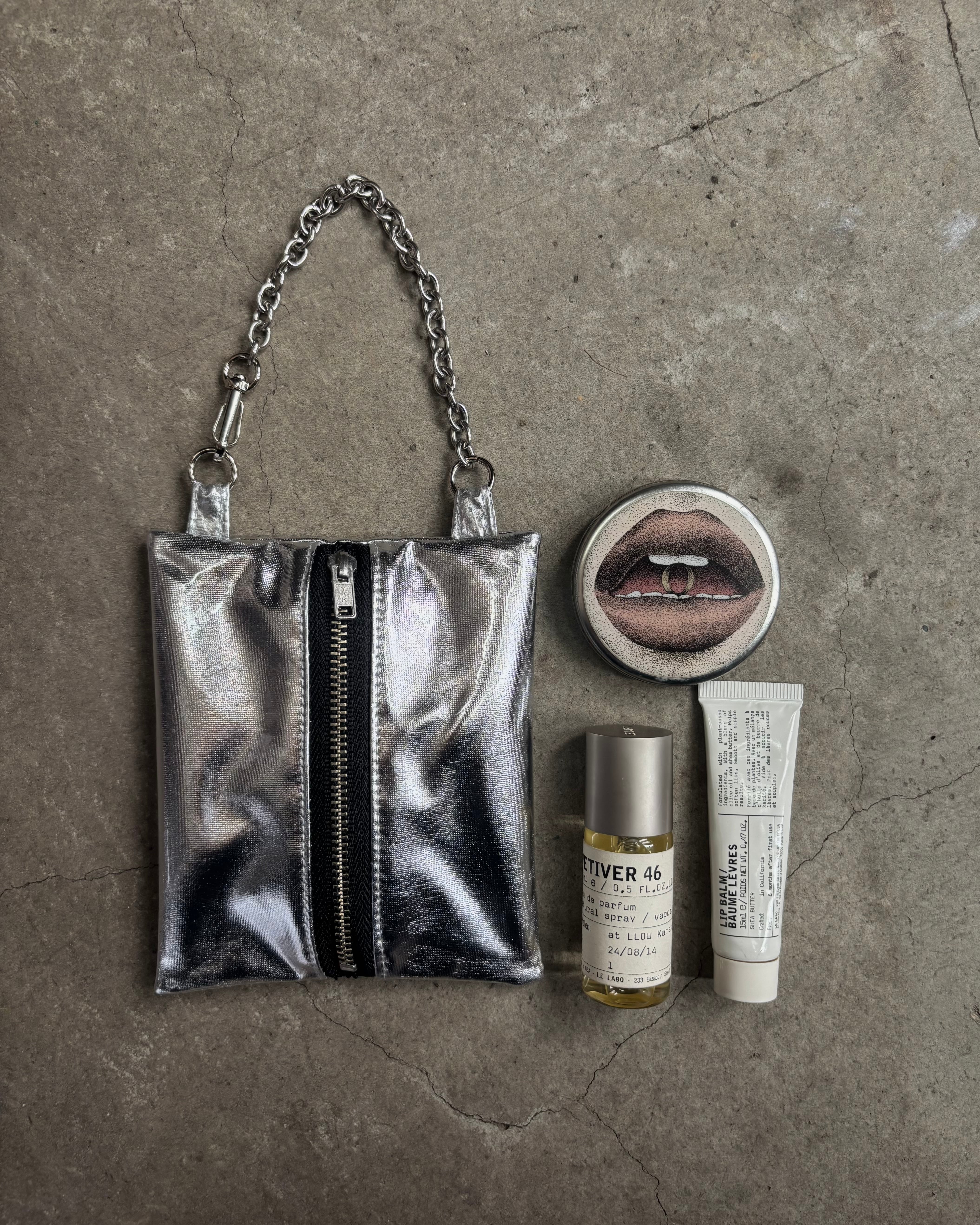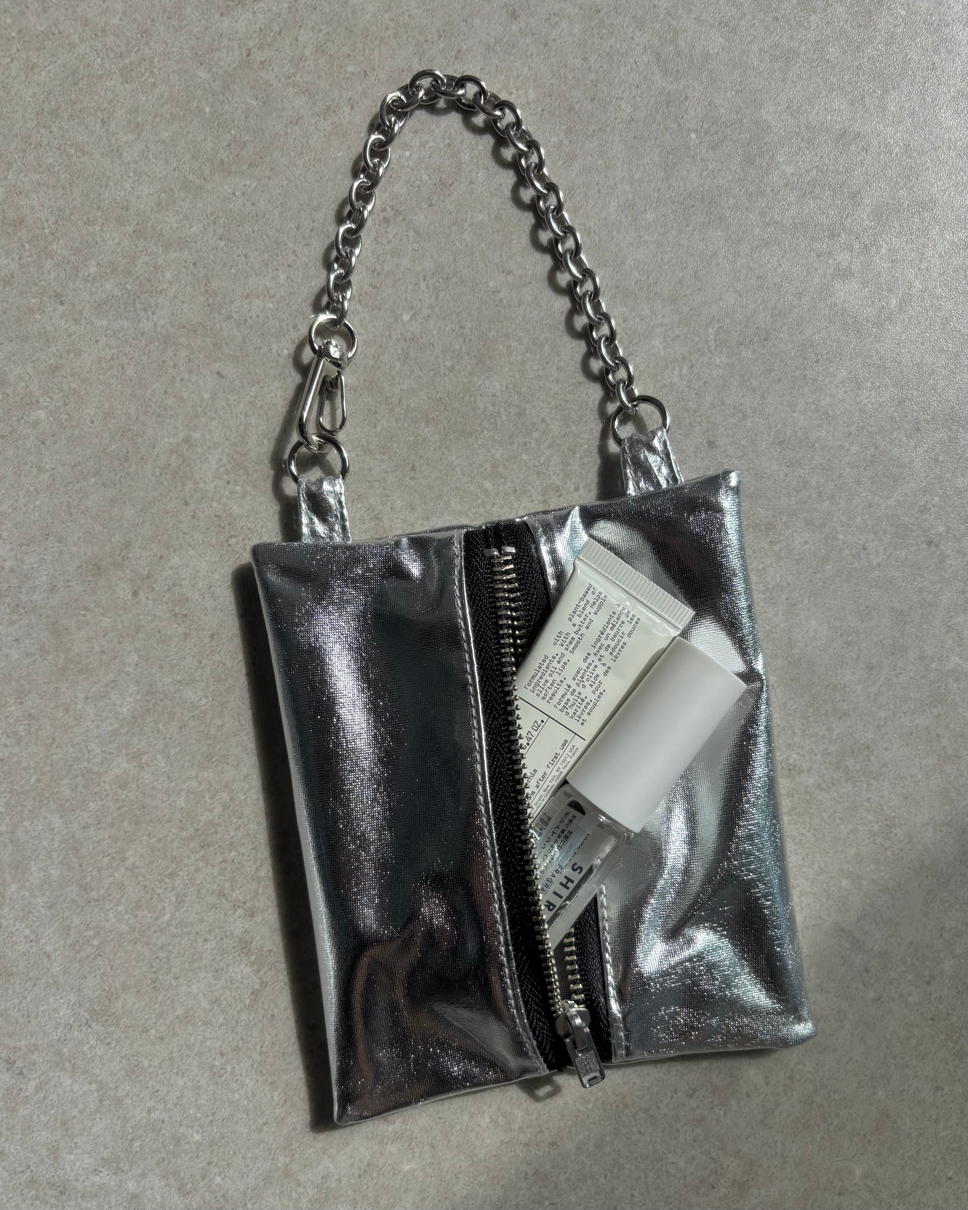 表面にビニール素材を貼った縦型のメタリックポーチ。