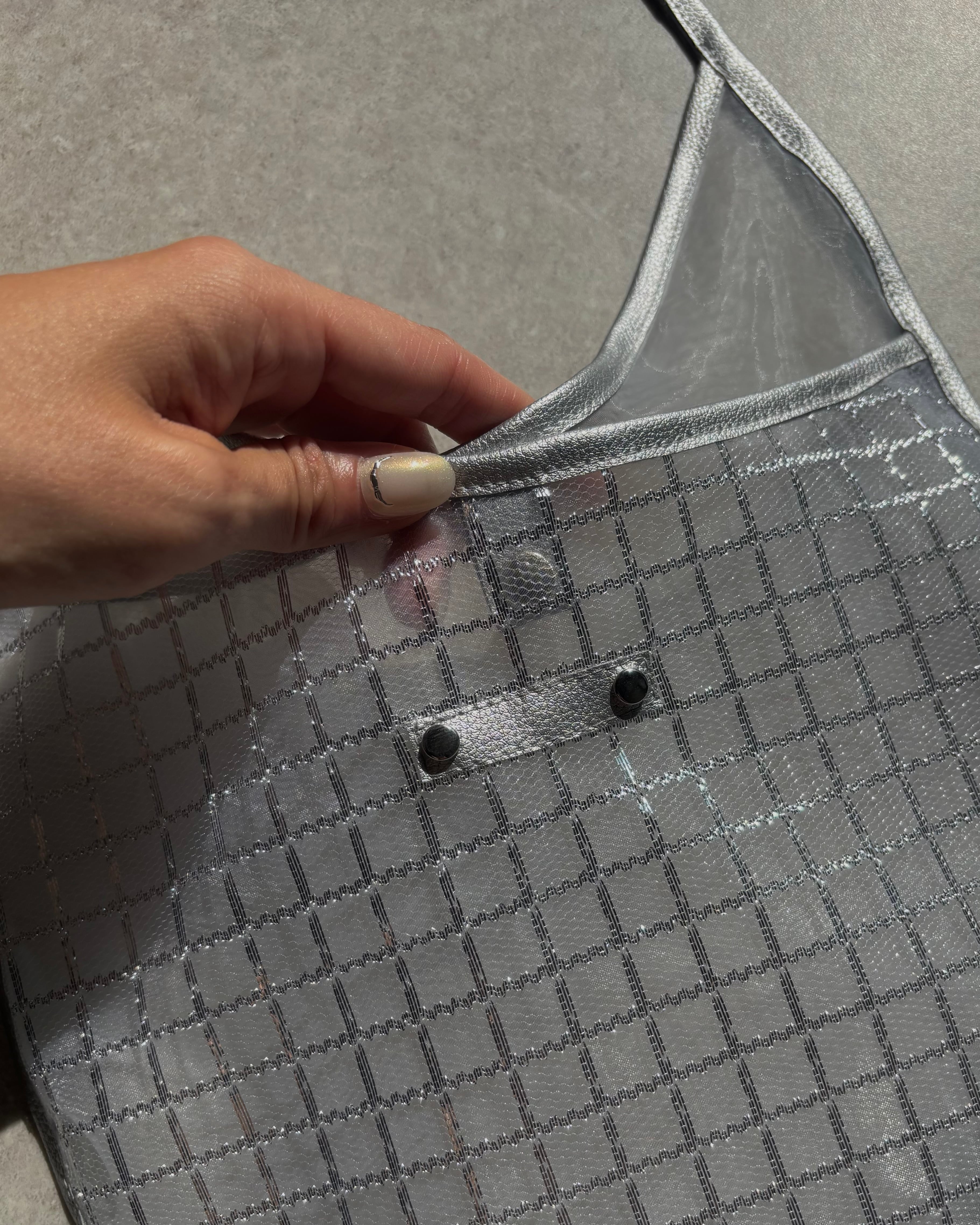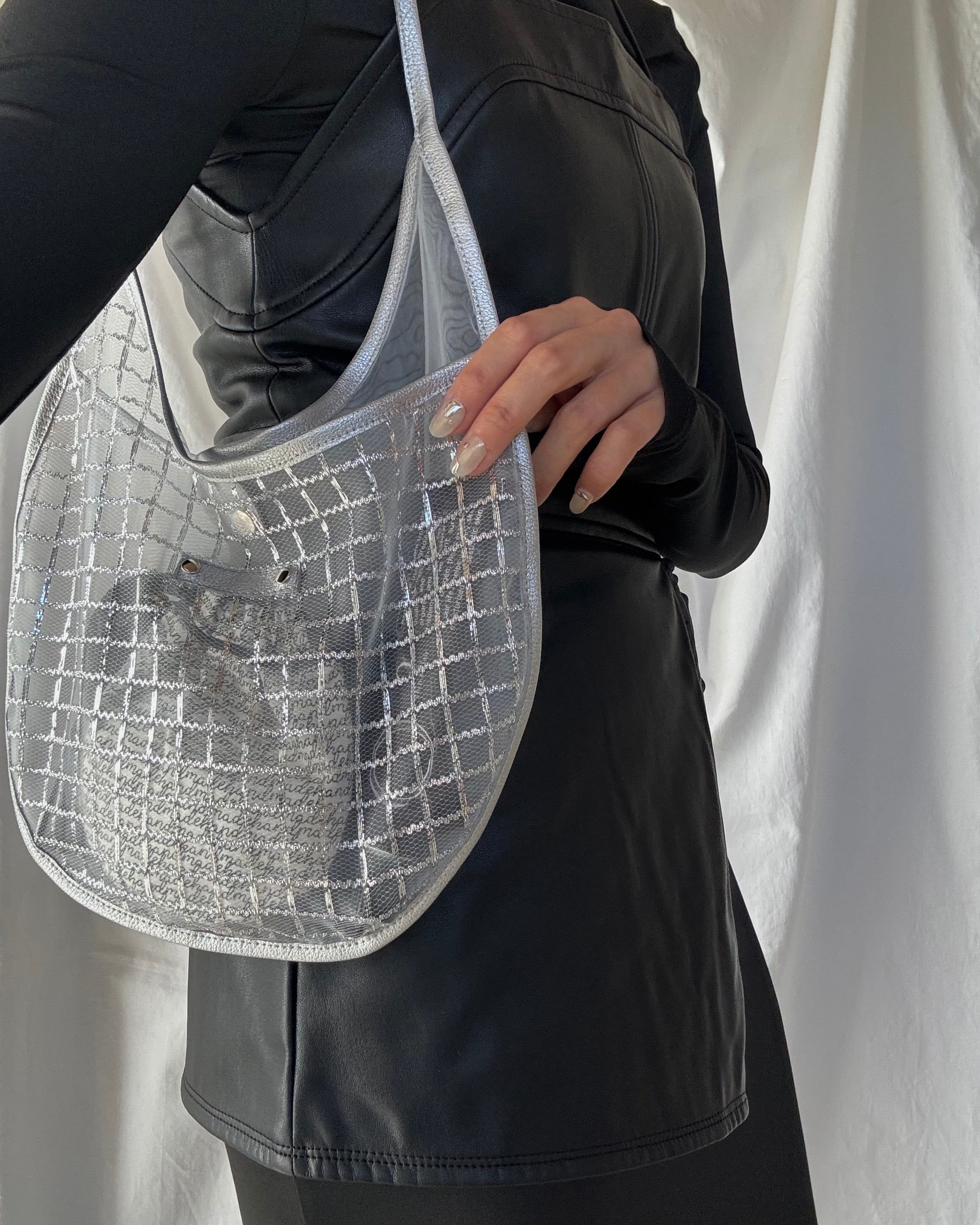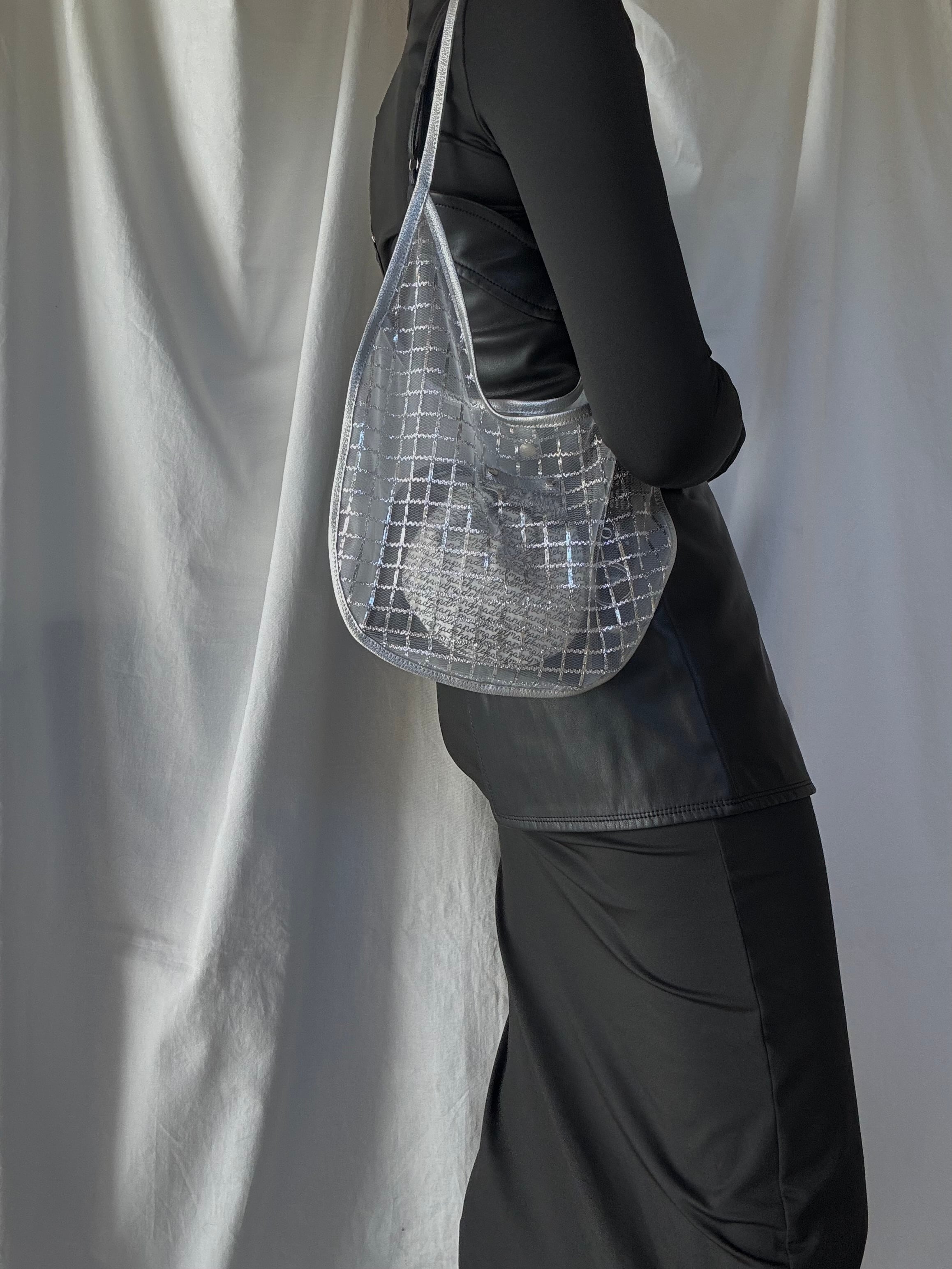 表はチェックのチュールと光沢感のあるオーガンジー素材を組み合わせ、反対側は光沢感のあるオーガンジーのみを使用した、雫のようなラインの柔らかでエレガントなドロップバッグ。